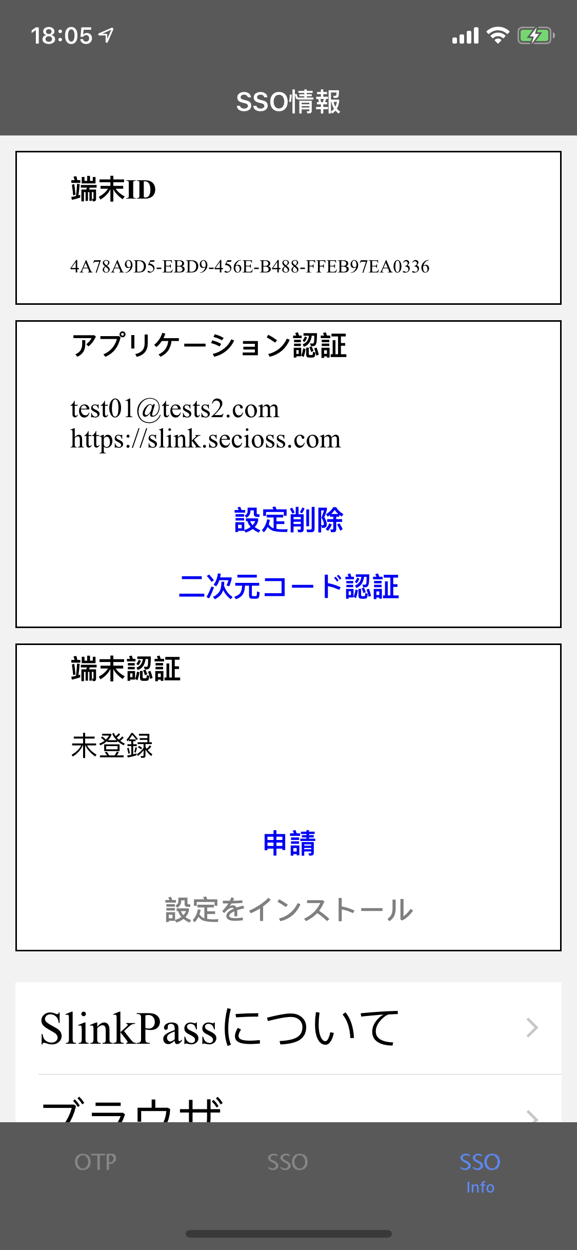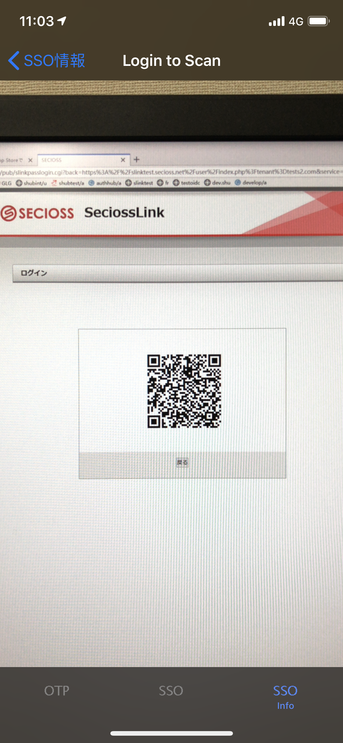 ここで、スマートフォンアプリSlinkPassを起動「SSO Info」タブを選んで、「二次元コード認証」をタッチしますとカメラが起動されます。