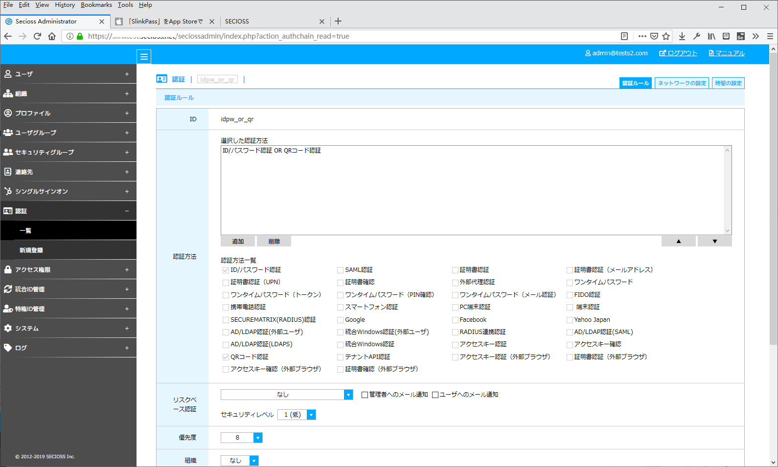 QRコードログインを利用する為、認証ルールに既存のIDパスワード認証のほか「QRコード認証」を「OR」条件で追加。