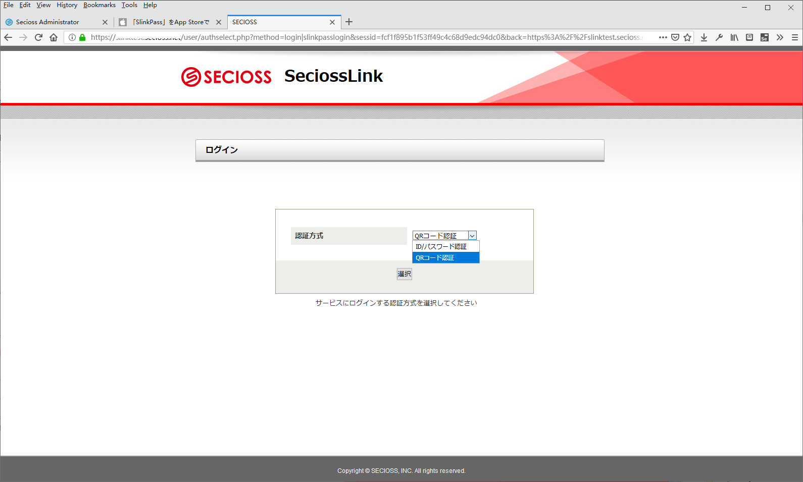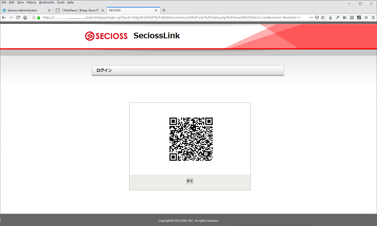 SeciossLinkのポータルへアクセス、ログイン画面に「QRコード認証」を選びますとQRコードログイン画面が表示されます。