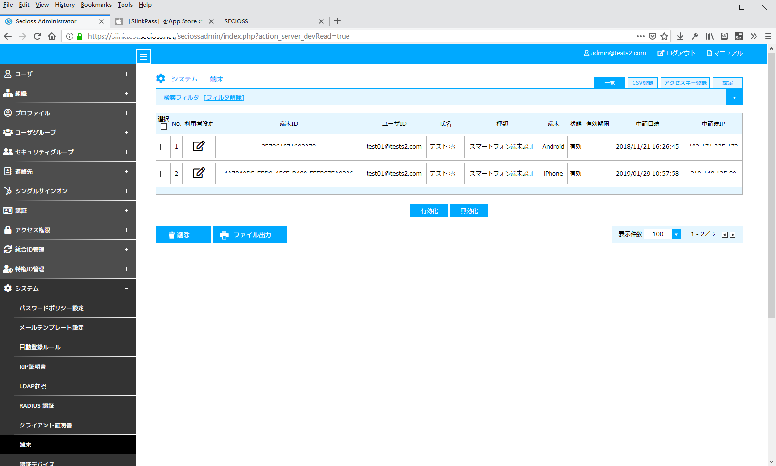 メニューから「システム」の「端末」にアクセス、申請した端末一覧が表示されます。