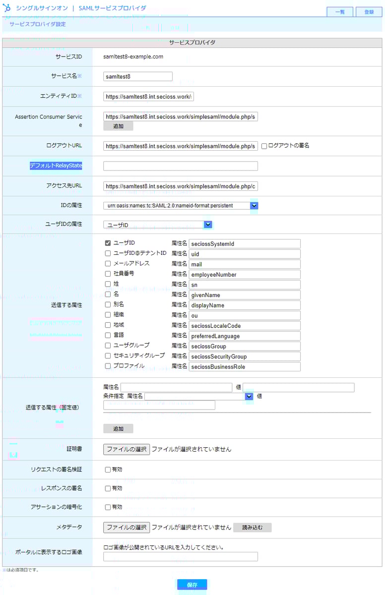 ※"https://samltest8.int.secioss.work/simplesaml/" は「エンティティID」で設定した値を設定してください。